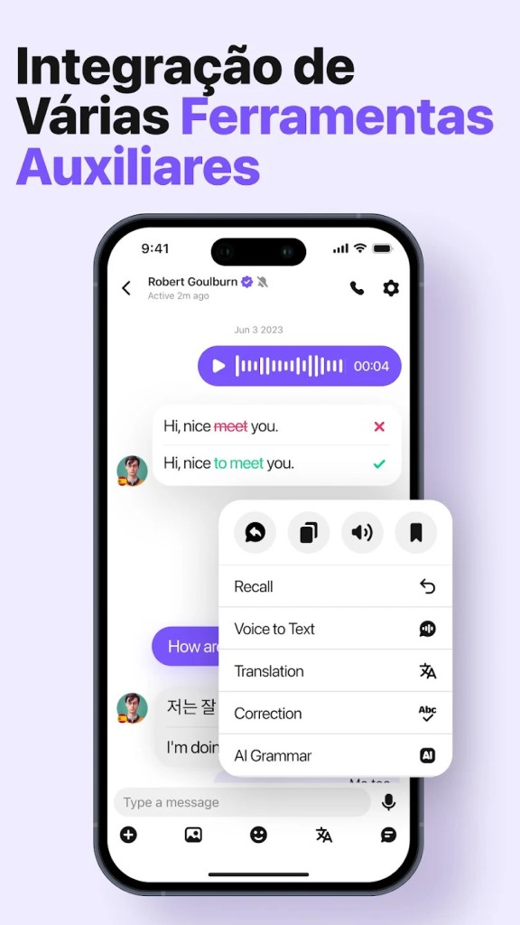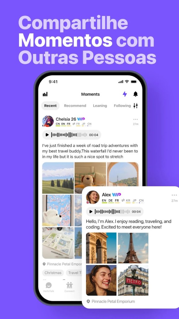 Durante as conversas, o aplicativo oferece ferramentas que tornam o aprendizado mais fluido. Tradução, transliteração e correção automática ajudam a entender melhor as mensagens e a perceber sua evolução. E há ainda o Moments, um espaço social onde os usuários compartilham pensamentos sobre idioma e cultura — pequenas histórias, dúvidas curiosas ou observações que acabam virando diálogos interessantes.
